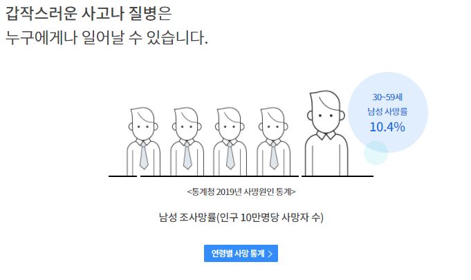 사람은 누구나 나이가 많으면 세상과 이별을 하게 되어있습니다. 하지만 나이가 많아서 이별하는 것과 그전에 질병, 상해 등으로 인하여 예상치 못한 개념으로 이별을 하게 되는 것은 매우 다른 상황을 초래하게 됩니다. 후자의 경우 경제 활동할 나이임에도 불구하고 그런 상황이 발생한다면 남겨진 가족들에게 너무나 힘든 상황이 초래될 수 도 있습니다. 하지만 보험으로서 이러한 상황들을 대비해서 미리 준비해둔다면 재정적인 부담금을 충분히 줄일 수 있습니다.