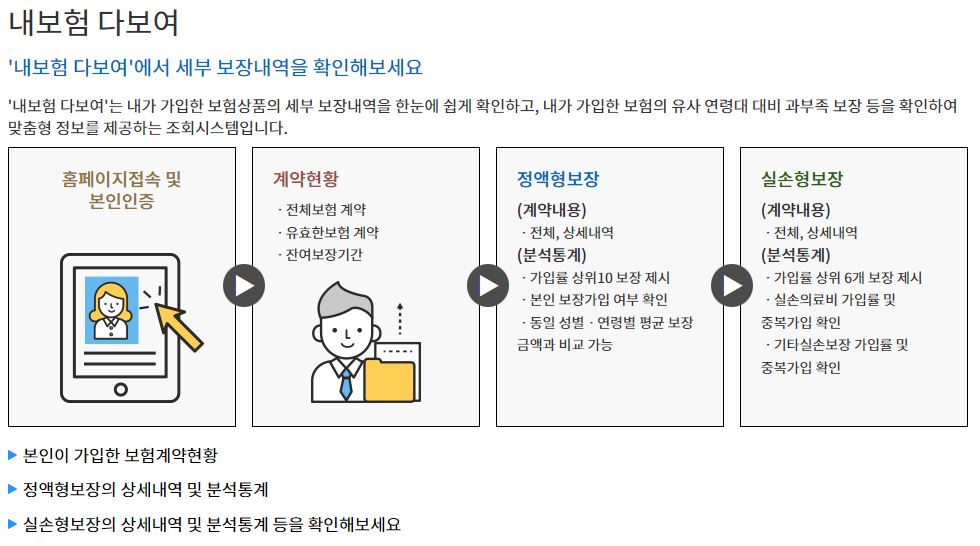 '내 보험 찾아줌' 서비스는 가입내역에 대한 조회가 가능하기 때문에 해당 보험이 어떤 특약이 있는지 가입조건이 어떻게 되는지 확인하기 어렵습니다. 기본적인 내용만 확인이 가능한 사이트입니다. 만약 어떠한 보험인지 전체적으로 궁금하시다면 '내보험 다보여' 이라는 사이트를 이용하면 확인하실 수 있습니다.